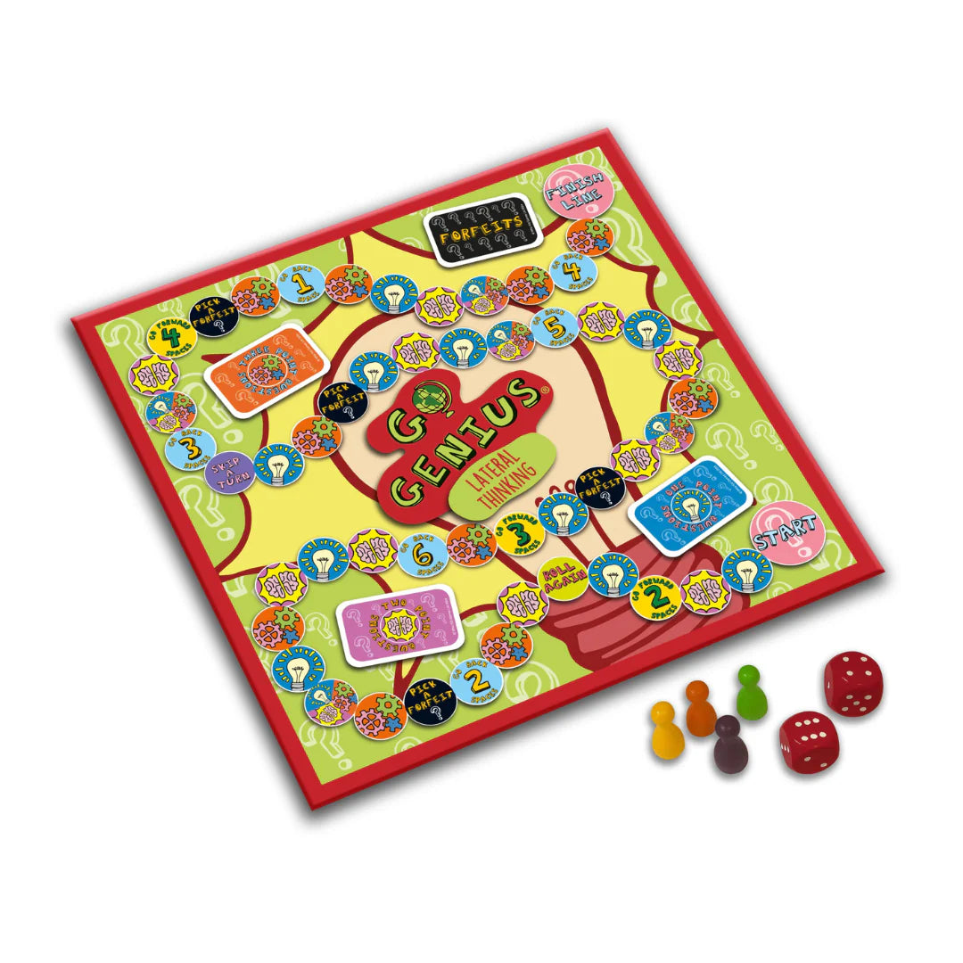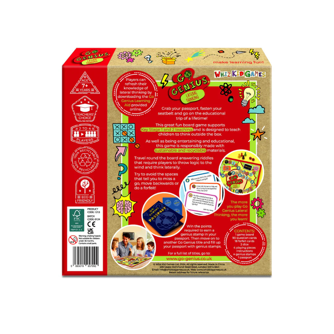 Grab your passport, fasten your seatbelt and go on the educational trip of a lifetime with this great fun board game. It is designed to help children think outside the box. The aim of the game is to get as many points as possible. Players travel round the board answering riddles that require players to throw logic to the wind and think laterally. They need to try and avoid the spaces that tell them to miss a go, move backwards or do a forfeit! Players who gain more than 15 points can put a genius stamp (provided) into their Go Genius passport (provided for children to personalise). Not everyone is a genius but the idea is the more you play the game, the more you learn. Once players have won the points required to earn a genius stamp for Go Genius Lateral Thinking, they can then move on to another Go Genius title and fill up their passport with genius stamps! As well as being entertaining and educational, Go Genius Lateral Thinking is responsibly made with sustainable and recyclable materials.