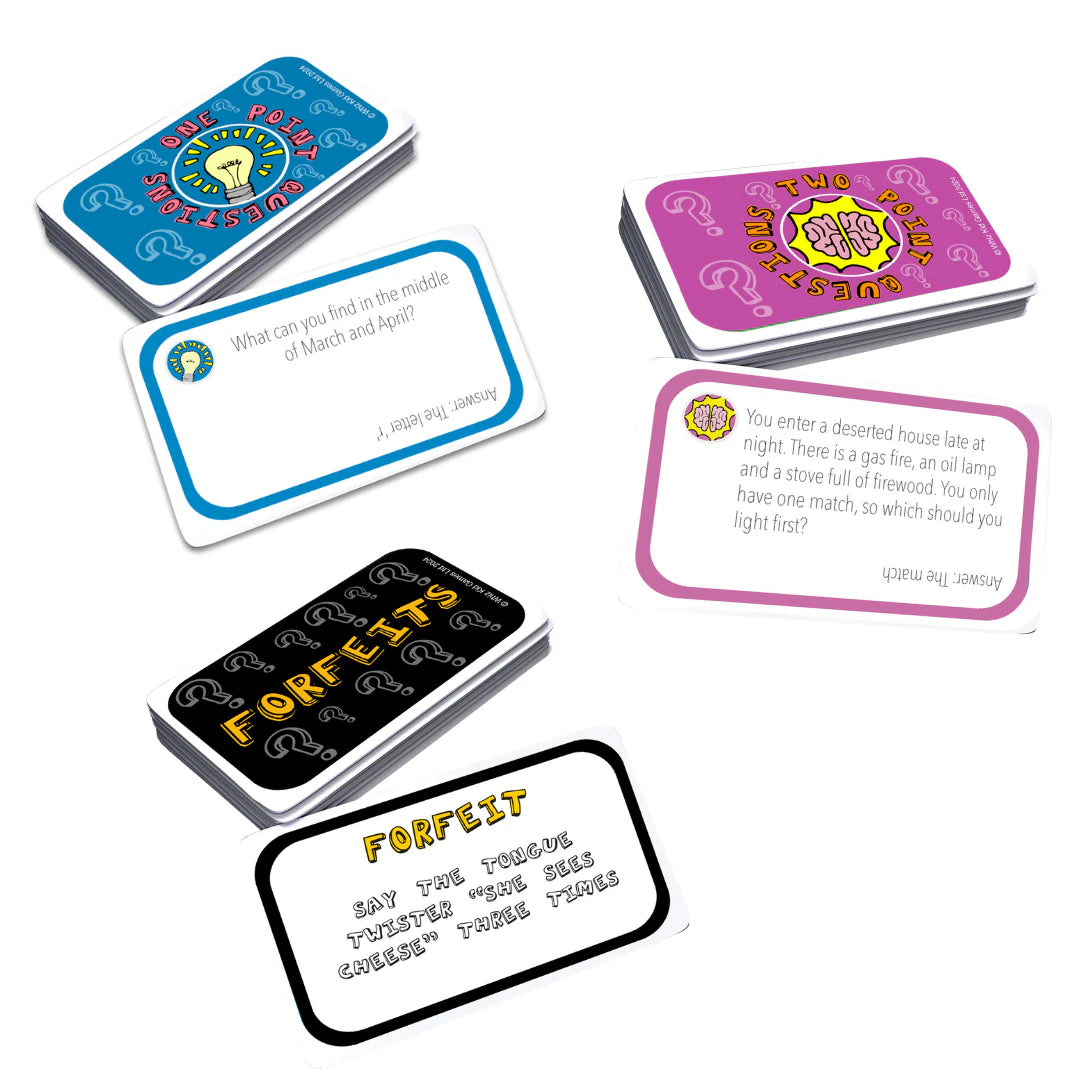 • Contents: Instructions, 1 game board, 90 question cards, 18 forfeit cards, 4 playing pieces, 2 dice, 4 genius stamps, 1 passport