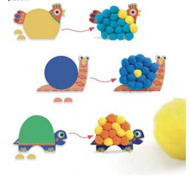 Contents: 3 animal-shaped cards (25 x 17 cm) with a self-adhesive section, 50 large colourful pompoms (diameter 4 cm), 6 stands to hold the animals upright and 1 explanatory booklet in colour.