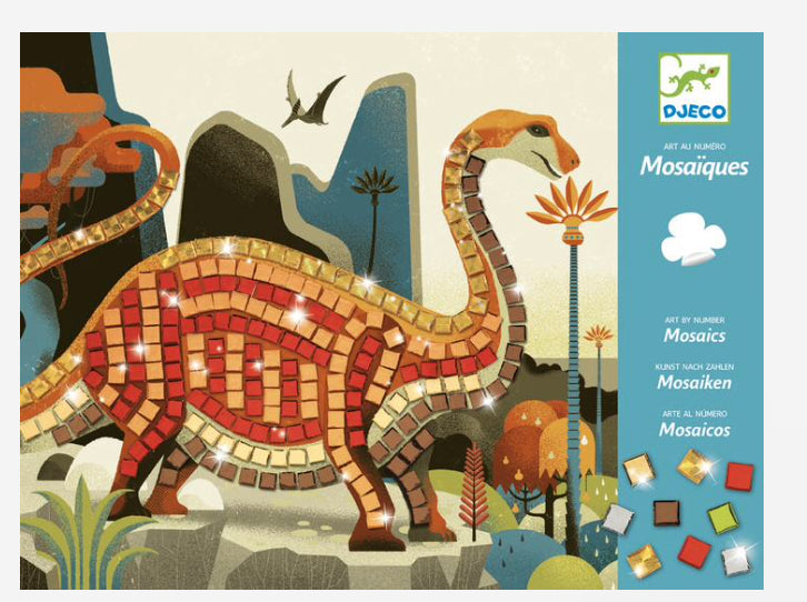 Djeco Mosaics Dinosaurs kit is one of the colourful range of mosaic by stickers sets that keep younger children happily occupied and absorbed in no mess creative fun.