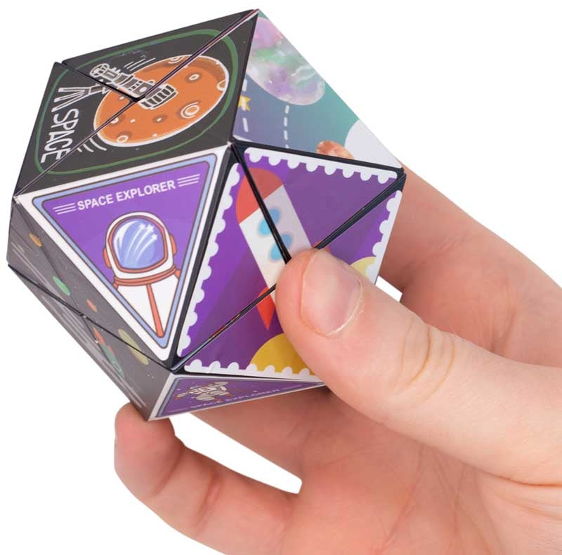 Discover new shapes with the Space-themed Polygon, a geometric shape that flips and folds together in a range of unique ways. Each polygon features one piece of space colour design on each side when combined.