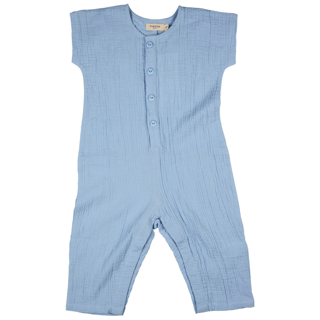 Fantastic organic cotton Muslin pale blue jumpsuit from Pigeon Organics. Features buttons down the front for ease of dressing.